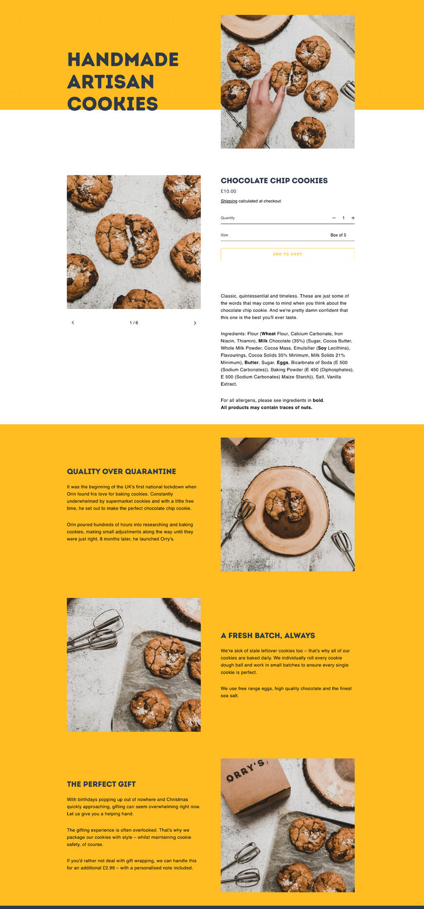 Founded Orry's, an artisan cookie company, during lockdown. Grew its presence in London, supplying local coffee shops and generating online sales. Focused on branding and market penetration with minimal advertising spend.